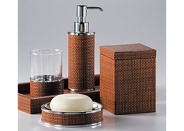 Предметы отделаны рельефной и коричневой, как клен, кожей, имеющей вид плетения из ротанга. Мыльница, дозатор для жидкого мыла и держатель для стакана дополнительно отделаны полированной пластиной хрома .