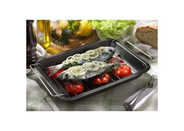 Противень с антипригарным покрытием с решеткой-гриль из нержавеющей стали очень удобно и практично использовать для запекания рыбы и мяса в духовом шкафу. Во время приготовления излишки жира стекают в противень. Мясо или рыба приготовятся без лишнего жира, а значит без лишнего холестерина. Эта новинка для тех, кто заботится о себе и предпочитает здоровую и легкую еду. Благодаря качественному антипригарному покрытию AMSALUS противень легко отмоется от жира. Вставка гриль снимается, можно использовать отдельно противень для запекания.