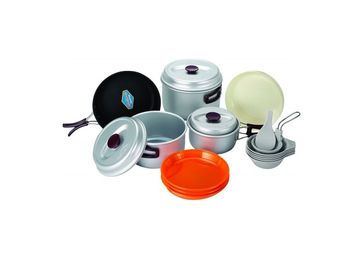 Туристическая посуда Kovea из алюминия с анодированным покрытием. В составе набора 3 кастрюли (2,8л, 1,8л, 1,0л), тефлоновая сковорода, пластиковые чашки,половник, лопатка.