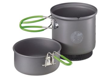 Ультра легкий 0,95 литровый набор туристической посуды из анодированного алюминия. В набор входит кастрюлька с крышкой, которая легко превращается в сковородку. Специальный теплообменник кастрюли уменьшает время закипания на 20%, экономя топливо. Кастрюля оснащена носиком для удобства при разливе жидкостей. Также, в набор входит сетчатая сумочка для транспортировки.