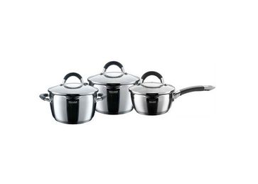 Состав набора RDS-341: кастрюля 24 см с/кр (5,7 л), кастрюля 20 см с/кр (3,2 л), ковш 16 см (1,6 л) Высококачественная пищевая сталь 18/10 Толщина стенок - 0,6мм Тройное вштампованное, а затем вплавленное дно Комбинированная (зеркально-матированная ) обработка внешней поверхности Внутренние отметки литража у каждой емкости Крышка из термостойкого стекла со специальным широким ободком и отверстиями 2 -х разных диаметров на нем для удобного слива жидкости. Дуршлаг Вам теперь не нужен :) Ручки из нержавеющей стали с вставками из силикона, не нагреваются Надежное клепочное крепление Плавный переход от дна к стенкам Упаковка подарочная с каталогом рецептов внутри Подходит для всех видов плит