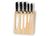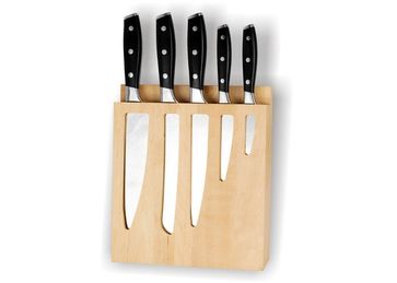 Материал лезвия ножа - Нержавеющая сталь Материал ручки ножа - Бакелит Цвет ручки - черный Цвет подставки - Светлое дерево Ножей в комплекте - 5 Нож поварской - 8", 2,5 мм Нож разделочный - 8", 2,5 мм Нож универсальный - 5",2 мм Нож хлебный - 8", 2,5 мм Нож для чистки и резки - 3.5", 2 мм