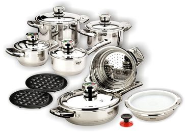 Набор посуды из 16 предметов (Voletta) Комплектация: 24 см Кастрюля с крышкой - 7.0 л 20 см Кастрюля с крышкой - 3,9 л 16 см Кастрюля с крышкой - 1,7 л 16 см Сотейник с крышкой - 1,7 л Сковорода с крышкой Диаметр / Объем - 24 см/3,1 л Пароварка Диаметр / Объем - 20 см/2,95 л 20 см Чаша для смешивания с крышкой - 2,0 л Бакелитовая подставка - 2 шт