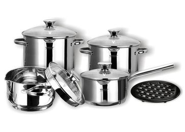 Набор посуды из 9 предметов (Rosalia) Комплектация: 20 см Кастрюля с крышкой - 4,4 л 20 см Кастрюля с крышкой - 3,2 л 18 см Кастрюля с крышкой - 2,9 л 16 см Сотейник с крышкой - 1,6 л Бакелитовая подставка - 1 шт