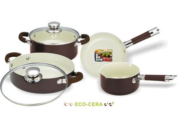 Набор посуды с антипригарным керамическим покрытием ECO-CERA из 6 предметов Комплектация: 24 см Кастрюля с крышкой - 3,1 л 20 см Кастрюля с крышкой - 2,8 л Сковорода - 20 см Ковш для молока - 16 см / 1,4 л