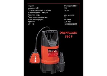 - Дренажный насос ERGUS Drenaggio 550 F (550Вт, высота до 7 м, до 10500 л час, грязная вода) по выгодной цене 1 450 р. руб.;