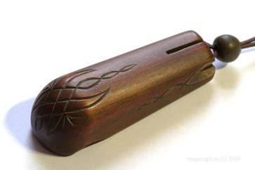 Футляр несет в себе тепло сибирского кедра, аромат воска. Инструмент органично, как бабочка с куколкой, слит с ним и закрепляется оригинальным замком из кожи и бусины. На нем изображен Ульзя - старинный знак Вечности Бытия.