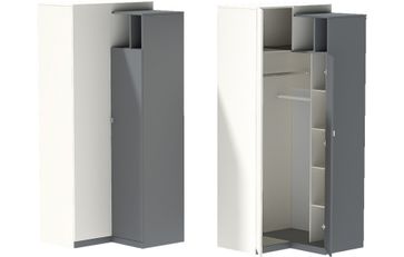 Клео ШКУ-1 Шкаф угловой — удобный, функциональный шкаф с необычной конструкцией. Шкаф разделен на 2 отделения: секция с 2 штангами и антресольной полкой, бельевая секция с 5 полками. Материал корпуса и фасада — ЛДСП. Сначала открываете створку в цвете Графит, затем - в цвете Миндаль. None Страна производства: Россия Есть доставка.