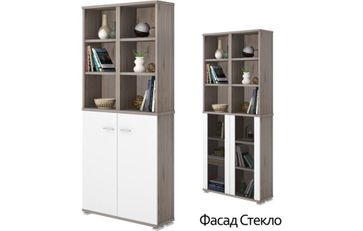Место расположения ручек на глухих фасадах может меняться по желанию покупателя. Фасад из ДСП можно заменить на стеклянный фасад. Пример стеллажа со стеклянным фасадом смотрите в разделе ”В интерьере”. Размер: 894Ш х 300Г х 2131В None