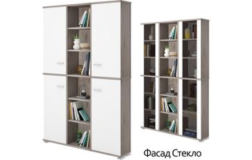 Вместительный стеллаж Прекрасно подходит для зонирования помещений Возможен индивидуальный заказ на большее кол-во секций. Место расположения ручек на глухих фасадах может меняться по желанию покупателя. Фасад из ДСП можно заменить на стеклянный фасад. Пример стеллажа со стеклянным фасадом смотрите в разделе ”В интерьере”. Размер: 1340Ш х 300Г х 2131В None
