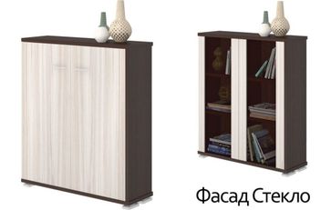 Место расположения ручек на глухих фасадах может меняться по желанию покупателя. Фасад из ДСП можно заменить на стеклянный фасад. Пример стеллажа со стеклянным фасадом смотрите в разделе ”В интерьере”. Размер: 894Ш х 300Г х 1096В None