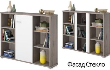 Место расположения ручек на глухих фасадах может меняться по желанию покупателя. Фасад из ДСП можно заменить на стеклянный фасад. Пример стеллажа со стеклянным фасадом смотрите в разделе ”В интерьере”. Размер: 1340Ш х 300Г х 1096В None