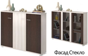 Место расположения ручек на глухих фасадах может меняться по желанию покупателя. Фасад из ДСП можно заменить на стеклянный фасад. Пример стеллажа со стеклянным фасадом смотрите в разделе ”В интерьере”. Размер: 1340Ш х 300Г х 1096В None