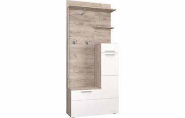 Система хранения шкафа представляет собой панель на которой установлена антресольная полка с небольшая штангой для вешалок, два крючка и небольшая полочка, на которой можно хранить ключи или зонты. Нижнюю часть корпуса занимает тумба. Высокая секция тумбы разделена на небольшой выдвижной ящик для различных мелочей и закрытое отделение с двумя полками для обуви. В секции тумба-банкетка также установлена полка для для обуви.