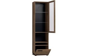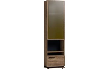 NATURE 13 Шкаф для посуды — высокий шкаф для посуды удобен своей функциональностью и эргономичностью конструкции. За тонированным стеклянным фасадом — 2 регулируемые по высоте бесцветные стеклянные полки. Витрина открывается за боковой свес. На открытой полке разместите фотографии или элементы декора, а за глухим откидным фасадом спрячьте документы и ценные вещи от посторонних глаз. Регулируемые опоры шкафа позволят компенсировать незначительные неровности пола. К шкафу можно докупить модуль ADELE 87 Подсветка. None Есть доставка.