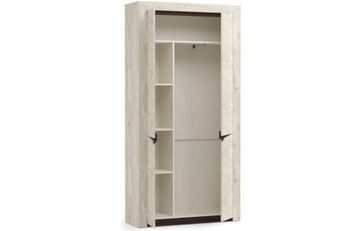 Модель имеет 2-е глухие распашные дверцы. Внутри полки и телескопическая вешалка для плечиков.