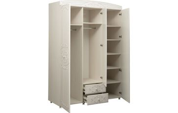 Модель имеет 3-е распашные дверцы (1 дверь зеркальная), за которыми секция с полками и 2-е секции с полками и горизонтальной штангой для плечиков.
