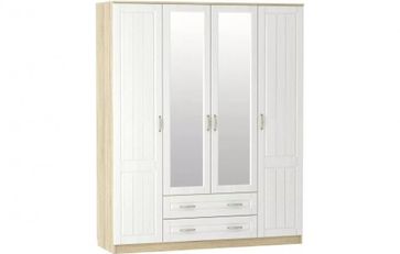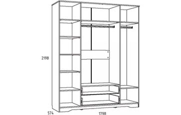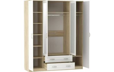 Модель снабжена двумя глухими, двумя зеркальными распашными дверями и двумя выдвижными ящиками. Внутри три секции: девять полок для одежды и два отделения с горизонтальными штангами для плечиков. None Есть доставка.