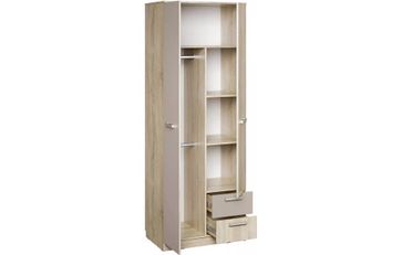 Конструкция с двумя распашными дверями. Внутри широкая гардеробная полка, под которой две секции, слева горизонтальная штанга для плечиков, справа три полки для белья и одежды и два выдвижных ящика для мелких вещей.