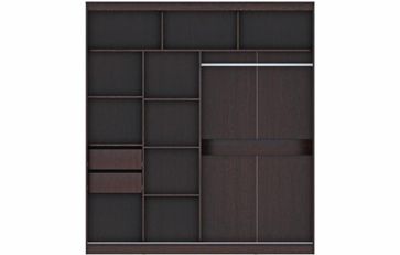 секция со штангой, занимающая половину пространства, секция с 3 полками; секция с 2 полками и 2 выдвижными ящиками; антресольная трехсекционная полка.