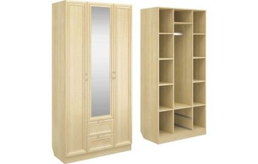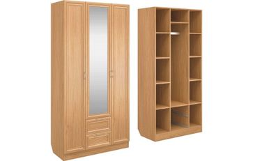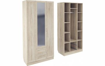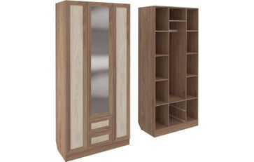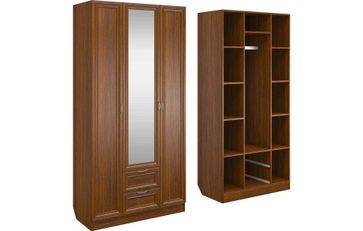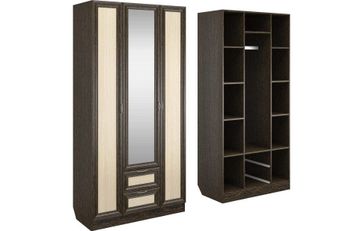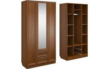 Корпус шкафа выполнен из Ламинированной ДСП высокого качества с насыщенным цветом. Фасады выполнены из материала МДФ.В данной моделе установлено зеркало, которое монтируется прямо в рамку фасада двери шкафа непосредственно на производстве.Шириною 100 см., большая и функциональная модель с отделениями закрытыми на три распашные двери. С права и слева симметрично друг другу, за дверками, располагаются отделения по пять полок в каждом. В центре за дверкой вверху небольшое отделение, сразу под ним отделение со штангой, внизу располагаются два выдвижных ящика. В данной моделе встроено одно зеркало в дверку и оно уже включено в стоимость шкафа. None Страна производства: Россия Есть доставка.