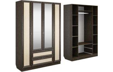 Корпус шкафа выполнен из Ламинированной ДСП высокого качества с насыщенным цветом. Фасады выполнены из материала МДФ.В данной моделе используются зеркала, которые внедрены в рамки фасадов.Шириною 140 см., красивый и удобный четырехстворчатый шкаф. По бокам слева и справа секции, по четыре полки в каждой. В центре сверху узкая ниша, под ней большая секция со штангой для одежды. В самом низу два выдвижных ящика. Два зеркала в данной моделе уже включены в стоимость. None Есть доставка.