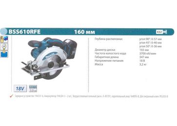- Пила дисковая аккумуляторная MAKITA BSS610RFE (18В, 165мм, Li-ion, 2акк-3Ач) по выгодной цене 15 500 р. руб.;