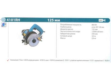 - Пила дисковая алмазная MAKITA 4101 RH (860Вт, 12000об мин, мокрая резка, 125мм, 5.2кг) по выгодной цене 13 150 р. руб.;