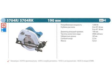 - Пила дисковая MAKITA 5704 RK (1200Вт, 4900об мин, пропил 66мм,190мм, 4.6кг, кейс) по выгодной цене 4 950 р. руб.;