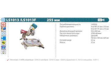 - Пила дисковая торц. консольного типа MAKITA LS 1013 (1430Вт, 3700об мин, пропил 91 300мм, подсв, 260мм, 21кг) по выгодной цене 21 900 р. руб.;