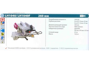 - Пила торцовочная MAKITA комбипила LH 1040 (1650Вт, 4800об мин, пропил 95мм, 255мм, 13.7кг) по выгодной цене 15 900 р. руб.;