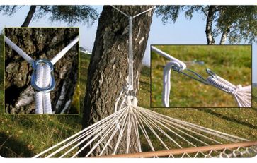 Традиционно гамак вешается между деревьями -так было у индейцев Америки, считающейся родиной «hamaka», так происходит и сейчас. Гамак – очень удобное и приятное место для отдыха на даче, в кемпинге, на пикнике. Но любой гамак ограничен определенной длиной, меж тем – не все деревья растут «под заказ» на нужном расстоянии. Для того чтобы подвесить гамак, нужно прочное крепление, оно же выполняет функцию «продления» нужного расстояния до ближайшего дерева. Так, расстояние между «рукавами» или кольцами для подвешивания традиционного латиноамериканского гамака составляет 3.0-3.5 м, но с помощью крепления длину гамака возможно как увеличить, так и уменьшить до нужного расстояния.