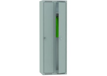 2 отделения, 1 полка и 1 штанга с крючками в каждом. 2 замка CAM LOCK*, секретность 200 комбинаций, вентиляционные отверстия на дне и крышке. Сборно-разборная конструкция. Существует возможность выбора шкафов различного способа сборки:
