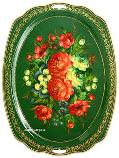 - Поднос Жостово с художественной росписью "Пионы на зеленом фоне", овал с фигурным краем, арт. 2109 в каталоге Подносы в Санкт-Петербурге;