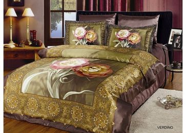 Постельное белье сделано из ацетатного (искусственного) шелка - ценного волокна, относящегося к числу полусинтетических. Уступая натуральному шелку в прочности и эластичности, ацетатный шелк превосходит его по блеску и гладкости нитей, обладая при этом гипоаллергенными свойствами.