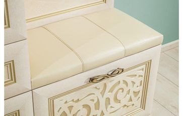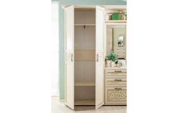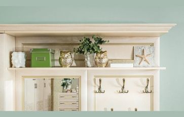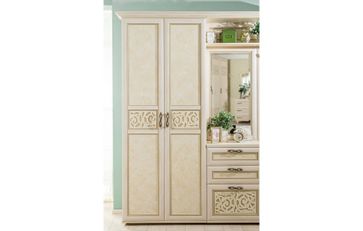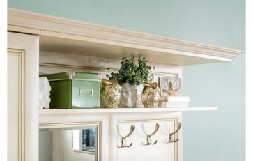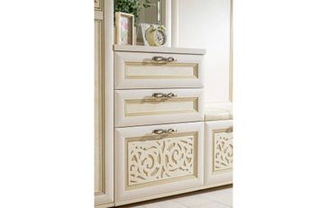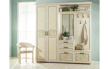 С изящной ажурной фрезеровкой и золотистым напылением на фасадах прихожая смотрятся роскошно. Патина на фасадах придает прихожей вид благородно состаренной классики. Восхитительные ручки - вензеля в цвет состаренной бронзы дополняют стильный образ прихожей. Прихожая стоит на ножках-опорах-это зрительно облегчает композицию. Большое количество модулей позволит создать уникальную композицию для прихожей любого размера с нужной функциональностью. Прихожая не только красива, здесь все предусмотрено и для удобного пользования: и тумба, на которую можно присесть, и грамотное чередование открытого и закрытого пространства, и выбор зеркальных или глухих фасадов. Качественная и надежная фурнитура – петли плавного закрывания дверей, шариковые направляющие – обеспечивают удобство в использовании и долгий срок службы мебели. Единая стилистика со спальней и гостиной «Александрия» поможет создать элегантный интерьер квартиры в едином неоклассическом стиле. Александрия Прихожая №1 (Кожа Ленто/Рустика) (ВШГ: 222.9216.650.5 см, материал корпуса: ЛДСП; материал фасада: МДФ) представлена в нашем магазине в нескольких размерах и цветовых решениях.Мы предлагаем самую выгодную цену на прихожую. А стоимость доставки, подъёма и сборки вы можете узнать в соответствующем разделе на нашем сайте или уточнив эту информацию у менеджеров по телефонам, через мессенджер или заказ обратного звонка.Для удобства выбора мы разместили подробные технические характеристики и 6 фотографий прихожей в различных цветах и решениях. None
