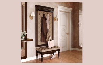 Прихожая Лилль — мебель в классическом стиле. Каркас вешалки и банкетки изготовлен из массива березы в тонировке Орех темный, он декорирован пилястрами, и цветочными мотивами. Вешалка оборудована 4 крючками, полочкой с бортиком для головных уборов. Банкетка имеет встроенный выдвижной ящик. Сидушка банкетки и мягкая вставка на вешалке изготовлены из экокожи с ромбовидной стяжкой. В составе комплекта: