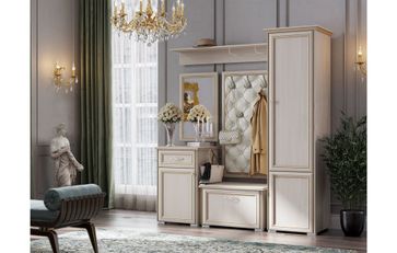 Модульная прихожая Парма — великолепный комплект для создания классического интерьера. Модули выполнены из ЛДСП (корпус) и МДФ (фасад) в нежном декоре Сандал светлый. Фасады декорированы золотой патиной. Изящные ручки косичкой дополняют изысканный образ. В составе комплекта: •Пенал (572х442х2064); •Тумба с ящиком (552х434х848); •Тумба (752х434х448); •Вешалка (708х60х1200); •Зеркало (508х22х800); •Полка (1266х250х166).Модульная прихожая Парма (ВШГ: 206.4187.644.2 см, материал корпуса: ЛДСП; материал фасада: МДФ) представлена в нашем магазине в нескольких размерах и цветовых решениях.Мы предлагаем самую выгодную цену на прихожую. А стоимость доставки, подъёма и сборки вы можете узнать в соответствующем разделе на нашем сайте или уточнив эту информацию у менеджеров по телефонам, через мессенджер или заказ обратного звонка.Для удобства выбора мы разместили подробные технические характеристики и 4 фотографий прихожей в различных цветах и решениях. None Страна производства: Россия Есть доставка.