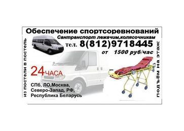 Дежурный санитарный транспорт на спортивных мероприятиях. Возможно обслуживание массовых мероприятий: в машине найдётся место не только для перевозимого травмированного пациента, но и для ДЕСЯТИ сопровождающих или для трёх колясочников одновременно. Из постели в постель. Подъём на этаж. Служба сиделок.