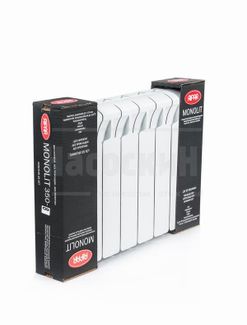 Биметаллический радиатор RIFAR Monolit 350 - 8 секций Биметаллический радиатор RIFAR Monolit 350 - 8 секций, это идеальное решение для квартир и загородных домов. Купить радиатор отопления для дома или дачи Вы можете в нашем магазине. Какую батарею отопления выбрать подскажут наши специалисты, оказав грамотную консультацию по подбору, необходимого именно Вам, оборудования. Радиаторы RIFAR имеют широкую линейку, с которой Вы можете ознакомиться у нас на сайте. Купить секции радиаторов rifar Вы можете по телефонам: 8(495)669-39-99 или 8(800)555-12-82 или приехав в один из наших магазинов в Москве или Санкт-Петербурге. В наших шоурумах представлены отопители, обогреватели воздуха, любые аксессуары Внешне похожий на обычные биметаллические и алюминиевые секционные радиаторы, радиатор MONOLIT отличается от них тем, что внутри него теплоноситель движется по стальным каналам, соединенным с помощью уникальной технологии сварки в единую неразборную конструкцию. Благодаря этому в радиаторе MONOLIT в принципе отсутствуют участки, потенциально опасные для возникновения протечек. Радиаторы MONOLIT обладают исключительной надежностью, а также высокой теплоотдачей, которая достигается за счет развитой геометрии теплопередающих поверхностей из алюминиевого сплава. Конструкция и технология изготовления биметаллического радиатора отопления MONOLIT обеспечивают: Долговечность эксплуатации. Гарантия производителя — 25 лет. Эффективность поддержания комфортного температурного режима. Высокую стойкость к коррозии. Каналы, по которым проходит теплоноситель, сделаны из стали повышенной коррозионной стойкости, а их толщина соответствует толщине обычных стальных водопроводных труб. Отсутствие межсекционных стыков. Индифферентность к типу теплоносителя и качеству его подготовки в системах индивидуального и коллективного отопления. Возможность использования в качестве теплоносителя различных незамерзающих жидкостей. Возможность использования радиатора при высокой (до 135 °С) темпе