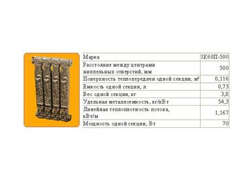 У этого радиатора один водяной канал и соответственно меньше строительные габариты, что делает удобным его применение при ограниченном пространстве площади подоконника. Конструкция его не имеет выступающих фрагментов и ребер, что препятствует накоплению пыли в собранном радиаторе.Небольшая тепловая мощность 0,07 кВт одной секции позволяет подобрать количество секций радиатора для отопления конкретного помещения с минимальными потерями тепла при теплоотдаче.При производстве радиатора 1К60П использован новый способ формовки передней стенки панели радиатора. Панель формируется как единое целое, полностью в нижней полуформе в виде плоского прямоугольника размером 560х65 мм.Появилась возможность художественного оформления панели как самостоятельного независимого элемента с различными вариантами изображения на ней, такими, как полосы, линии, насечки, круги, овалы, и т.д., вплоть до художественного рисунка или символа на собранном радиаторе из n-го количества секций. None