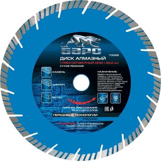 Диск предназначен для сухого резания, армированного бетона различных марок, кирпича, природного камня.На основание из стали 65Г, методом горячего прессования, закреплены режущие турбо-сегменты , состоящие из порошков различных металлов и высококачественного синтетического алмаза. Сегментная форма, обеспечивает производительное резение и эффективный вынос шлама из зоны резания. None Страна производства: Китай