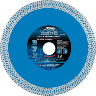 Диск предназначен для сухого и мокрого резания, керамической плитки, керамогранита, природного камня.На основание изстали 65Г, методом горячего прессования, нанесён режущий слой, состоящий из порошков различных металлов и высококачественного синтетического алмаза.Сплошной режущий слой, позволяет получить чистые, ровные края без сколов и трещин. None Страна производства: Китай