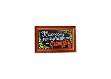 Доска серии "Кинг" имеет черную акриловую панель в качестве экрана, в качестве рамы выступает аналог картинной раны двух видов расцветки (рыжий+золото и черный+серебро) и световую подсветку 7 цветов. В комплекте с доской поставляется один белый маркер, контроллер для управления скоростью мигания светодиодов, адаптер, шнурок, 2 полотенца для стирания надписей, инструкция и гарантийный талон.Действует система скидок при заказе от 5 шт. Для получения подробной информации, свяжитесь с менеджером магазина по телефону или электронной почте. None