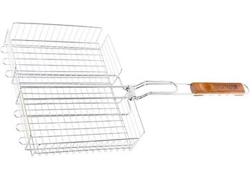 Решетка-гриль предназначена для приготовления мяса, птицы, рыбы и овощейнад углями на открытом воздухе. Фиксация верхней решетки на разной высоте позволяет запекать продукты любой толщины (стейки, куриные окорочкаи др.). Изготовлена из высококачественной жаростойкой стали с хромовымпокрытием. Деревянная рукоятка не нагревается и хорошо лежит в руке, что обеспечивает безопасность приготовления пищи. Увеличенные опорные стержни позволяют удобно расположить решетку на мангале и задействовать ее поверхность полностью. Широкое и плоское кольцо-фиксатор предотвращаетсамопроизвольное открывание решетки. None Страна производства: Китай
