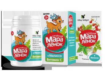 Витамин С и мелисса в составе витаминизированного драже способствует нормализации нервной системы ребенка и укреплению иммунитета. Драже «Алтайский мараленок» -100% натуральный витаминизированный продукт для детей без консервантов и вредных добавок. Применяется в качестве специализированного пищевого продукта диетического профилактического питания для детей старше 3 лет – для профилактики дефицита витамина С, гиперактивности и нарушений сна.