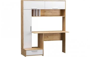 Рабочий стол отлично подойдет для комнаты школьника или организации домашнего офиса. Современный дизайн конструкции прекрасно впишется в интерьер любой комнаты. На широкой столешнице можно свободно разместить ноутбук, настольную лампу и письменные принадлежности. Богатая система хранения позволит содержать рабочее место в чистоте и порядке. Конструкция состоит из закрытого вертикального блока с тремя полками, выдвижного ящика и двух объемных ниш с откидными дверцами. Дополнительно в систему включена большая открытая полка с отсеками для документов.