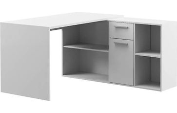 Классический белый стол гармонично вольется в интерьер комнаты и при этом не займет много места. Широкая столешница позволит свободно разместить ноутбук, настольную лампу и письменные принадлежности. Система хранения стола состоит из тумбы с четырьмя открытыми нишами разного размера, одного закрытого шкафчика с полкой внутри и выдвижного ящика. Благодаря такой конструкции, на рабочем месте легко поддерживать порядок и все необходимое всегда будет под рукой.