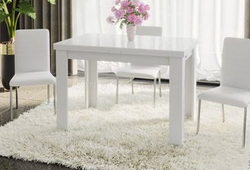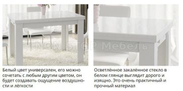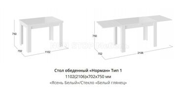 Стол обеденный раскладной со стеклом Норман тип 1 Цвет Белый / Стекло белый глянец Размеры (Д×Ш×В): 1102(2106)×702×750 Стулья как на изображении можно приобрести дополнительно - стоимость уточняйте Исключительная практичность и долговечность стола «Норман» обусловлена высоким уровнем качества сырья, а так же пристальным контролем на всех участках производства. Долговечным это изделие делают высокопрочные элементы из ламинированной древесностружечной плиты 22 мм, которая надежно удерживает фурнитуру, скрепляющую конструкцию. Столешница со стеклом выглядит изящно и дорого. Стекло для столешницы применяется особое его трудно разбить. Такие свойства обусловлены особой технологией, которая применяется при производстве данного типа стекла. В результате стекло получается чрезвычайно прочным. Это так называемое «закаленное стекло». Дополнительное достоинство этого стекла состоит в том, что оно, если и разбивается, то на безопасные для человека фрагменты. Раздвижной стол «Норман» очень удобен в эксплуатации. В сложенном состоянии он занимает немного места, а в случае прихода гостей позволяет с удобством и комфортом всех разместить None