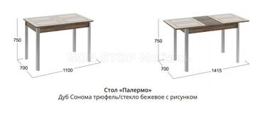 Стол обеденный раскладной на металлических ножках Палермо Цвет Дуб Сонома трюфель/Стекло бежевое с рисунком Размеры (Д×Ш×В): 1100(1415)×700×750h Стол «Палермо» сделает вашу кухню красивой, стильной и удобной. Идеально подчеркнёт любое дизайнерское решение. ХАРАКТЕРИСТИКИ МЕБЕЛИ: Столешница: ЛДСП 16 мм «Дуб Сонома трюфель/стекло бежевое с рисунком», вставка ЛДСП 22 мм «Дуб Сонома Трюфель»; Опора/Ножки: металлические, покрытие «хром»; Обработка торцов: Кромка ПВХ; Фурнитура: Направляющие синхронного раздвижения, механизм вставки - «Бабочка»; Габаритные размеры: 1100(1415)х700х750 мм; ОСНОВНЫЕ ПРЕИМУЩЕСТВА МОДЕЛИ: Стол «Палермо» отвечает последним модным тенденциям и идеально подходит для оформления любого интерьера. Металлические ножки добавляют надежности нашей новинке. Благодаря им стол имеет небольшой вес, что упрощает его транспортировку. Кроме того, они устойчивы к механическим повреждениям. Ножки не деформируются даже при сильных ударах, не навредят им нагревание и влажность. Дополнительное покрытие ножек хромом не только придаст благородный блеск новинке, но и защитит ее от коррозии. Столешница новинки выполнена из ЛДСП и покрыта сверху закаленным стеклом. Благодаря этому стол не смотрится громоздко, стильно выглядит. Стекло придает изделию дополнительную воздушность, визуально увеличивает пространство. Также, благодаря стеклянному покрытию, стол «Палермо» не будет бояться влаги и останется устойчивым к механическим повреждениям. Вам не придется покупать скатерть и бояться, что стол испортится, поцарапается или на него попадет влага. Новинка имеет классическую прямоугольную форму. Он может стоять как в центре комнаты, так и у стены или даже в углу. А благодаря скругленным углам, он будет безопасен во время эксплуатации. Ещё одним плюсом стола «Палермо» является возможность раскладывания. Это позволит сэкономить пространство, а в случае визита гостей стол легко расширит свою поверхность. Если вы хотите испытывать на своей кухне чувство легкости, све